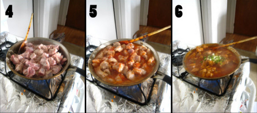 排骨入油锅(图4),煎到表面呈金黄色。加入调好的酱汁和适量清水,小火炖15min(图5)。大火收汁,撒入葱花(图6)。