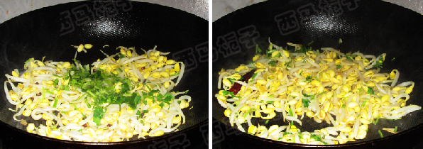 锅中注入油,下入花椒 辣椒炒出香味。倒入沥干水分的黄豆芽。