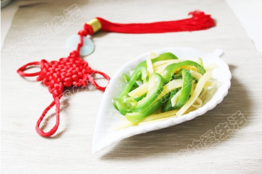 5.放入青椒丝翻炒一会,加盐、糖入味即可。