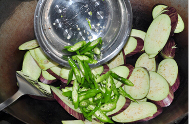 将茄子和辣椒与炒香的姜蒜片混合并炒匀