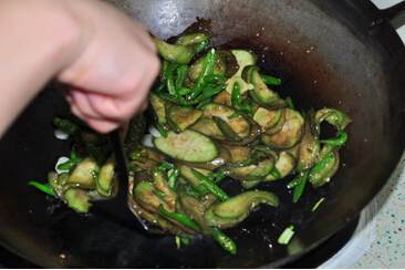 下锅以后中火快速翻锅煸炒至茄子和辣椒熟软