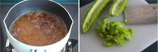 苦瓜洗净纵向剖开,用钢勺挖去内瓤,再切薄片。