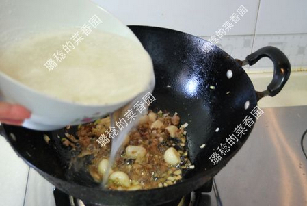 锅中留底油,放入猪肉馅,小火炒至变色吐油。