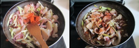7.锅内放入清水,加入姜片,料酒,细盐,大葱烧开后,放入鱿鱼;
