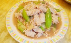 6.鱿鱼拨去软骨,剥去表皮,切开洗净后,打上花刀,且成大小适中的块备用;