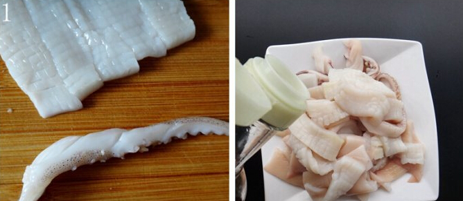 1.鱿鱼切十字花刀,鱿鱼须厚的地方也划开,加入料酒腌制十分钟。
