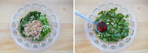 5.待炒好的虾皮放凉后,倒入盛有香葱和香菜的容器里。