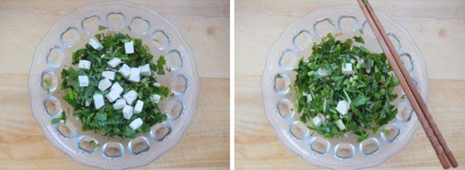 2.香葱和香菜切成粒盛在容器里。豆腐切丁后在沸水中汆烫20秒后捞出来沥干。