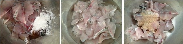 所有片好的鱼片装大盆中,加适量淀粉抓一会再清洗干净,沥干水分后加柠檬汁和胡椒粉腌制15分钟。