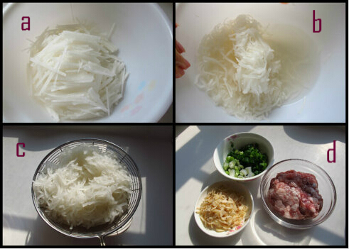 白蘿卜去皮切細絲(或刨絲,圖a), 加兩小勺鹽巴, 抓一抓後靜置半小時以上,讓青澀的水份盡量釋出後(圖b), 用清水沖洗掉鹽份, 瀝乾捏干備用(圖c).其他材料備妥: 蝦皮,蔥花,豬絞肉。(圖d)