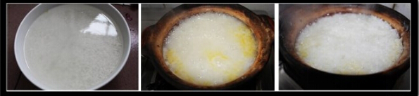 2.砂锅底部抹上一层油,然后把米和水倒进去,水和米的比例在1.5:1左右比较适宜。先大火煮开。
