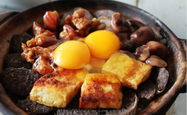 7.烧到饭表面有一个个的洞,扑扑冒泡的时候就可以把食材摆上去了。打一个鸡蛋,竟然是双黄的,幸运啊。儿子嫌我的干肠油太少,我又把上顿剩的红烧肉扔进去几块。