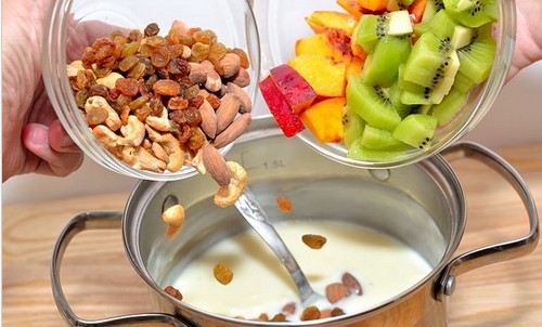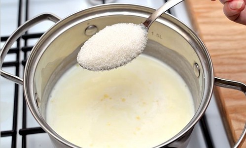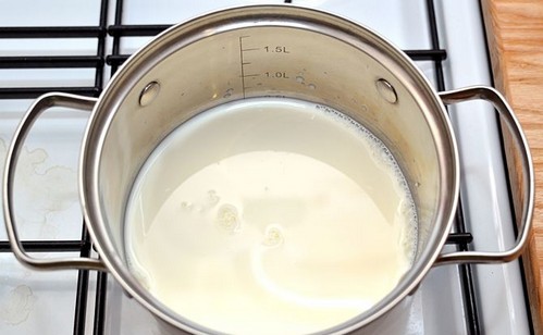把调好的混合物放进煮沸的牛奶中,持续搅拌。